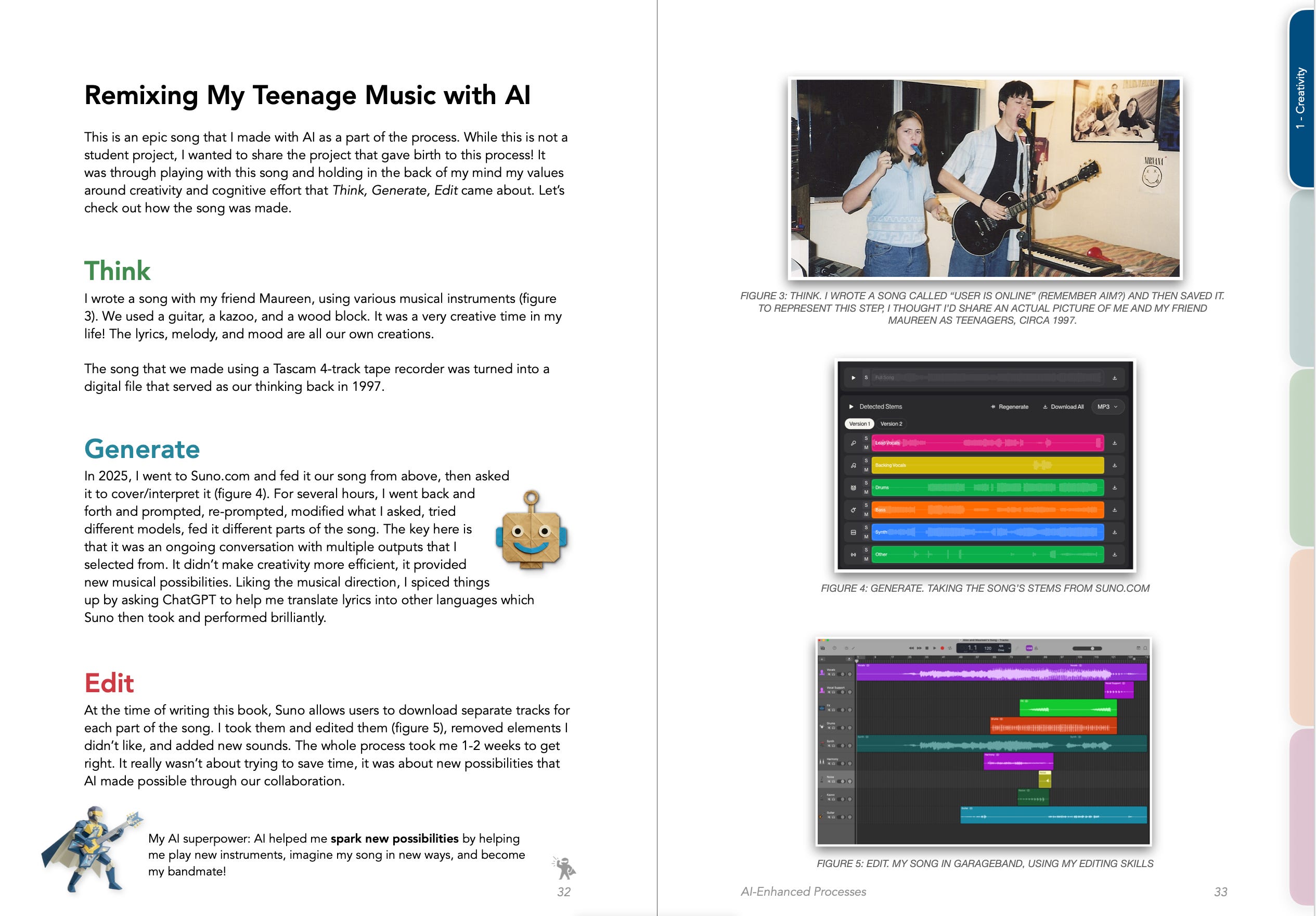 As shown above, I took a collaborative approach. In this case, a collaborative approach looked like both AI and I contributing to a new and unique song. I uploaded a song that I made as a kid (think), then had a conversation with AI and generated several covers that were more refined with additional instruments (generate). Finally, I edited the song using GarageBand, added effects, and removed sounds (edit). If I had used generative AI to quickly make a song without engaging in any effortful thinking, I might have written a half-hearted prompt in Suno (AI platform that makes music) and called it a day. I’ve seen kids do the same thing, basically telling it to “make a song” without much thought, effort, or process to support their thinking and effort. Without the process, the amusing output from Suno would probably have been meaningless slop that had stopped at entertainment.