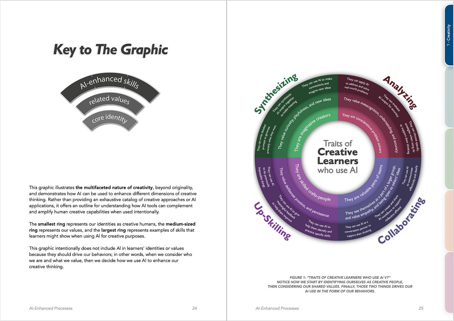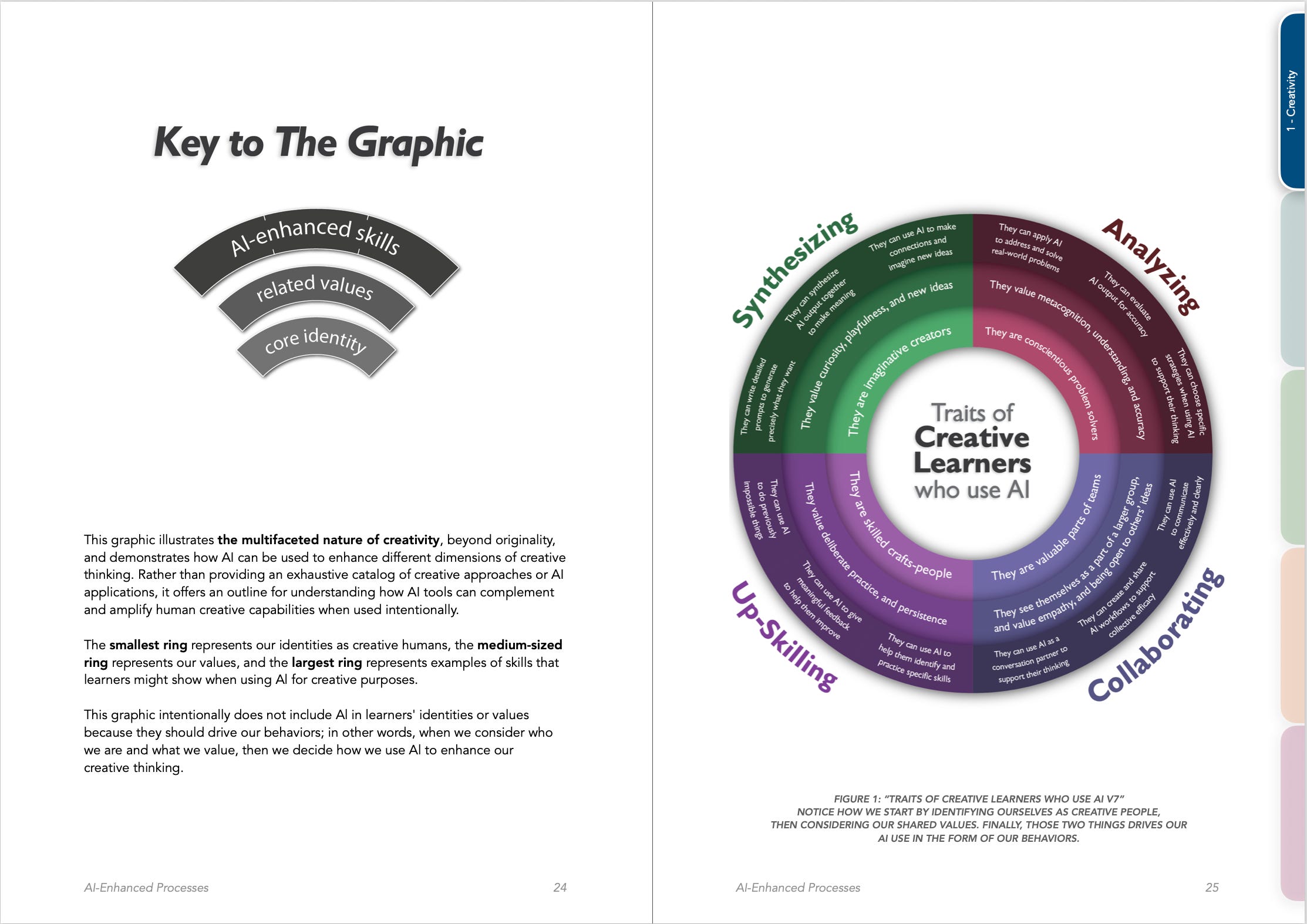 The point of all of this is that we have a definition of how we use AI (our behavior) when it is driven by our values and identities. The graphic also defines creativity in four domains: synthesizing, analyzing, collaborating, and upskilling. I thought that it was worthwhile to look at how creative thinking is actually quite broad and that it’s not just thinking about making something original.