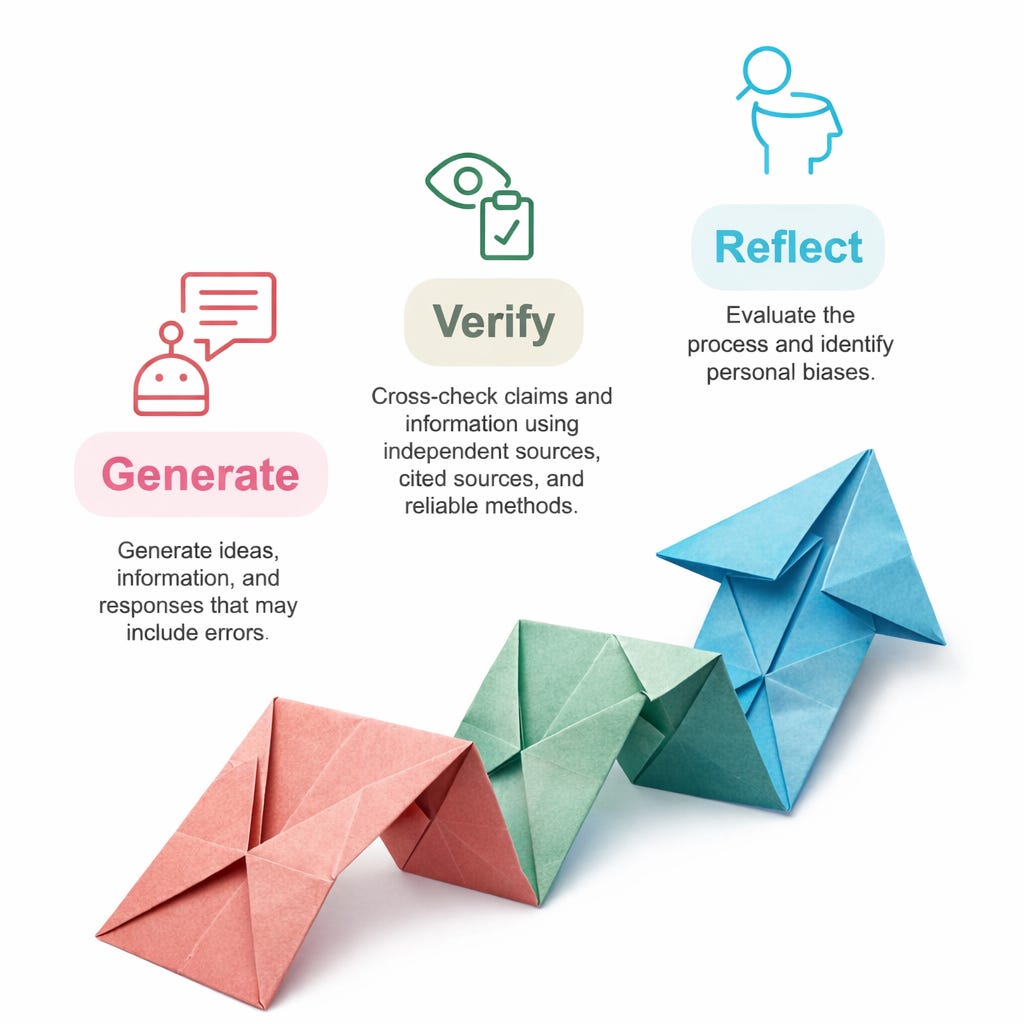 The Generate, Verify, Reflect process (below) may appear simple at first glance, but the key idea is that all three steps are essential whenever we encounter new information, especially from AI platforms. Often, students stop after the first step, accepting what they see without verifying its accuracy or reflecting on their own assumptions. What I want to make explicit is that teachers must intentionally create time for all three stages if we hope to help students cultivate genuine information literacy skills with AI.