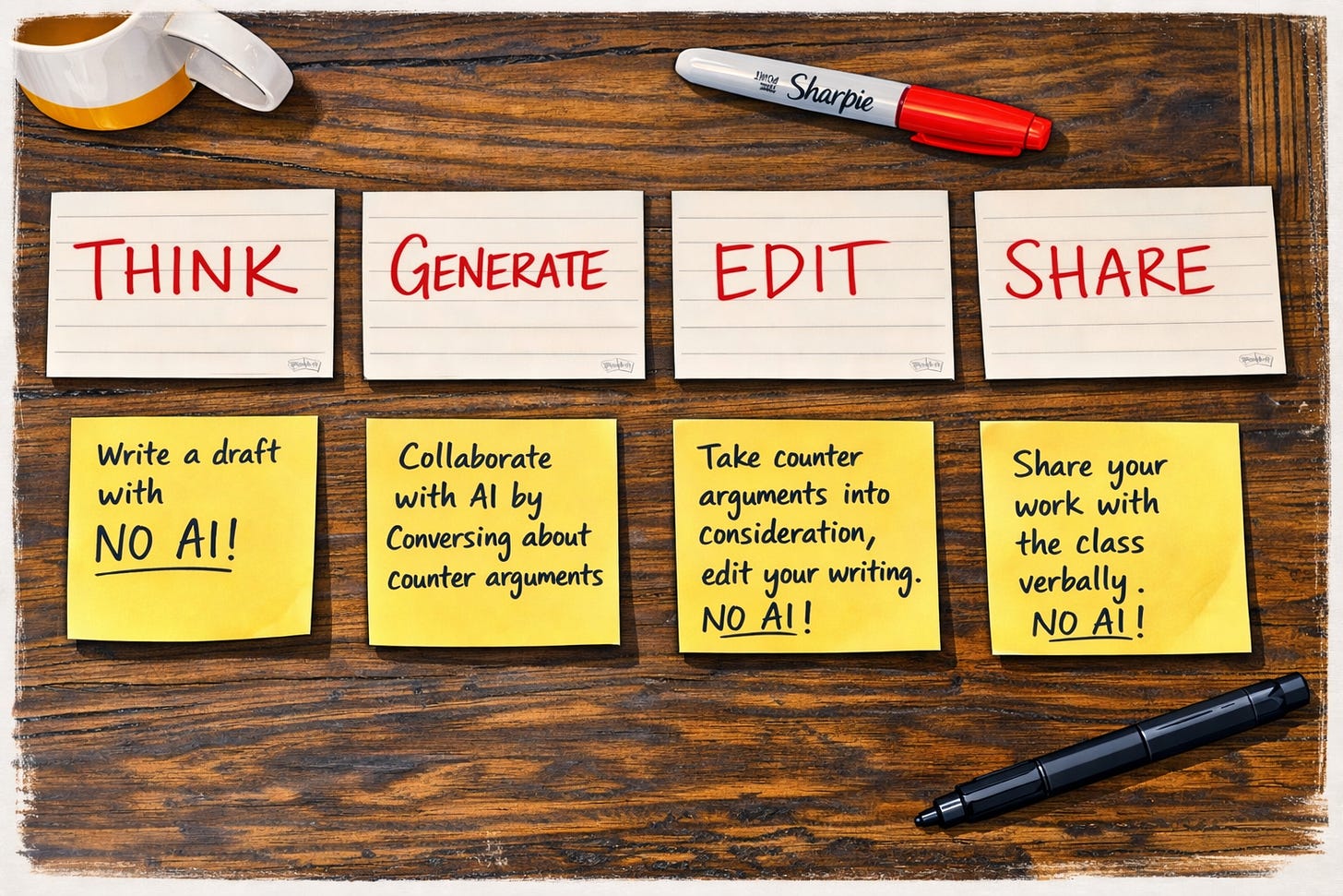 Naming the thinking in a process is an idea borrowed from Project Zero’s work around making thinking visible. And in that sense, this is not really a new idea; it’s the notion that we consider the category of thinking, and then name the verb we want students to practice. For example, the category might be to think critically, and the verb might be to evaluate. Project Zero suggests that if you care about thinking, you have to design for it. You have to name it, value it, and make it observable, because what a classroom repeatedly reinforces and rewards is what students learn to do. And with AI, if we don’t name the thinking, the easiest path of the least resistance wins: creating a polished product automatically. It’s tempting for students to skip the messy process that requires effort and to focus on task completion. If we do name it, we can build the habits of mind we actually want to instill in our students.