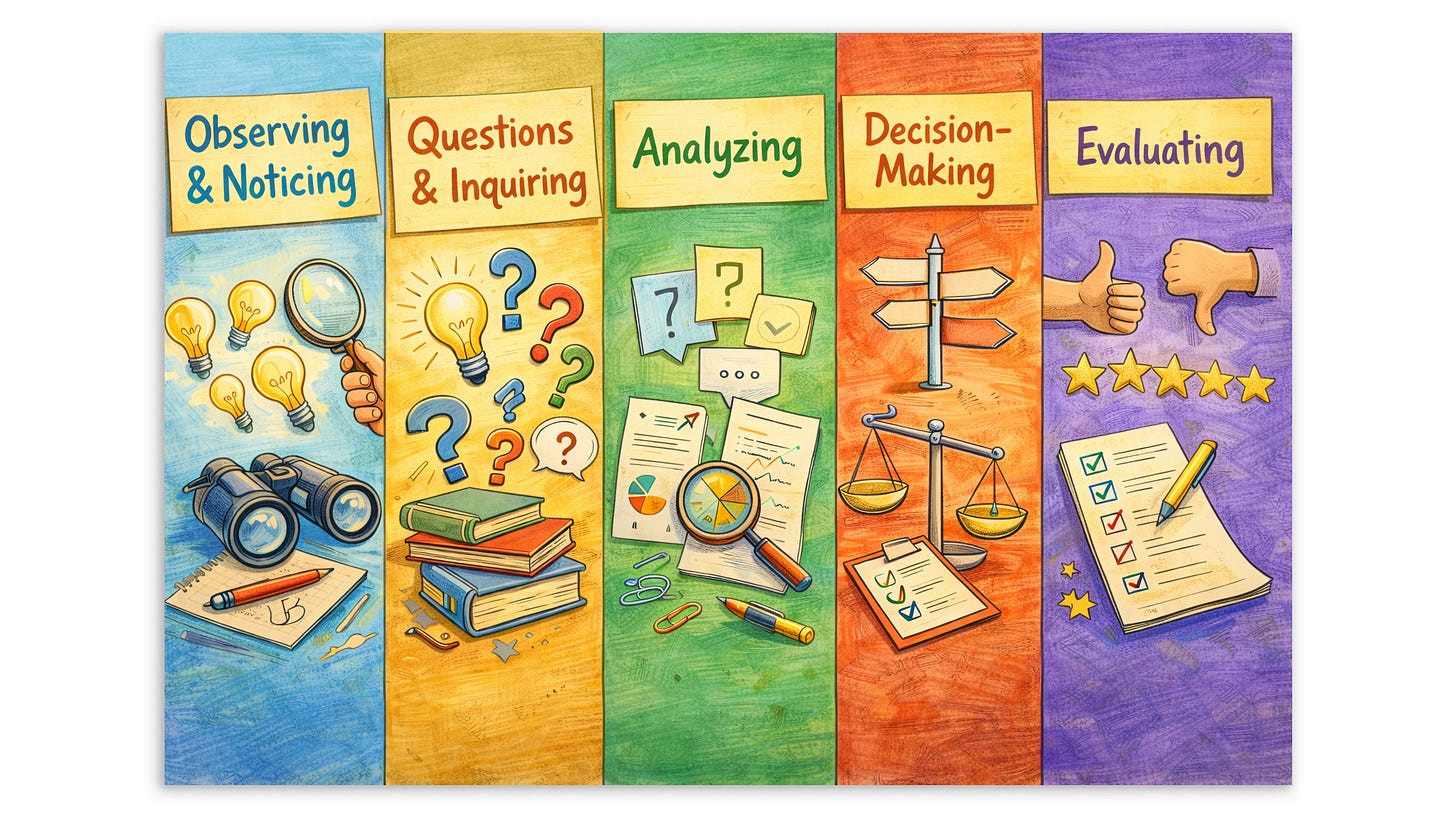 A variety of action-oriented thinking moves (generate, analyze, evaluate, reflect) that build toward a larger outcome.
