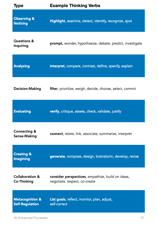 Below is a preview of my book with samples of words that we can draw upon. It’s not an exhaustive list, but it’s a good place to start, helping us think about what we mean by “naming the thinking moves”. Notice the bolded words under the “Example Thinking Verbs” column. Those are things that AIs can currently do quite well on their own or in collaboration with our children.