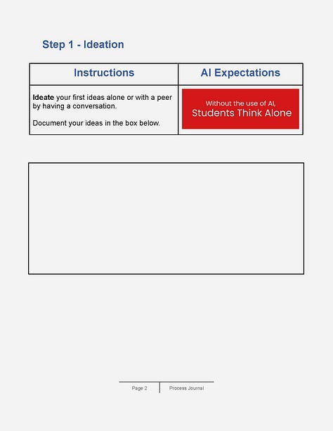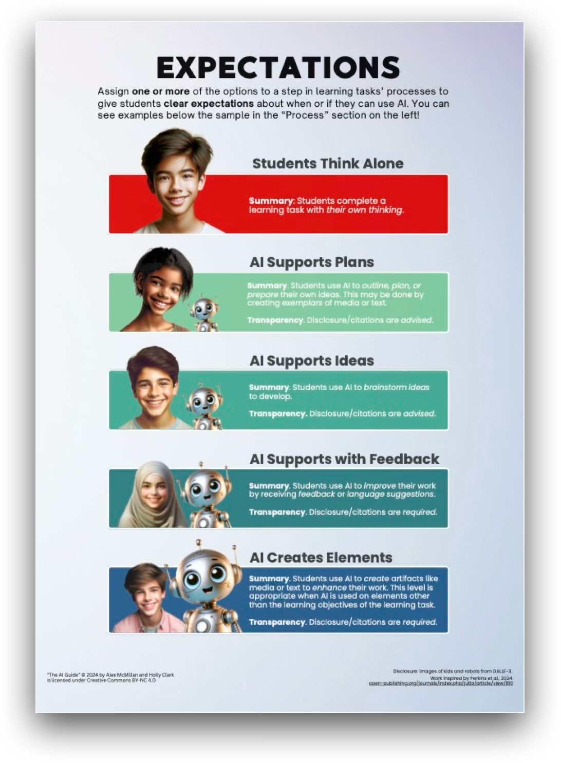 One option is the Expectations Scale that Holly Clark and I created. It helps you label what AI can and cannot do within each step of a process. For example: “During empathizing, you may use AI to give feedback on the depth of your interview questions,” or “During outlining, you may use AI to help you structure your plan.”