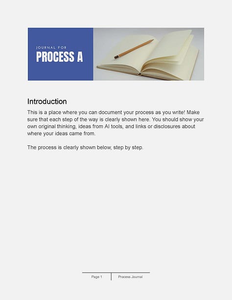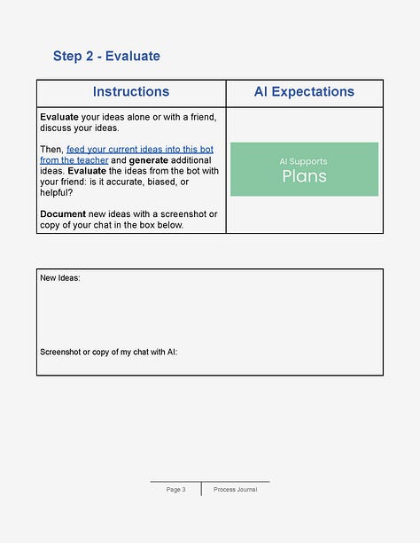 A process journal gives students a single place to capture “breadcrumbs” of their thinking as it evolves, and it gives teachers something coachable while the work is still happening. It also scales cleanly: a simple template in Google Docs, Word, or Pages can be duplicated for every student through an LMS, then adjusted up or down with prompts, feedback boxes, links to vetted tools, and clear expectations. The result is one adaptable tool that holds instruction, links to purpose-built bots, reflection, and evidence of learning together, instead of trying to reverse-engineer what happened from a polished final draft. In fact, final drafts can sit in the process journal! It’s such a powerful move to ask students to submit their process journals to their teachers that include the final draft because it shows that we value the thinking and the work leading up to the final piece.