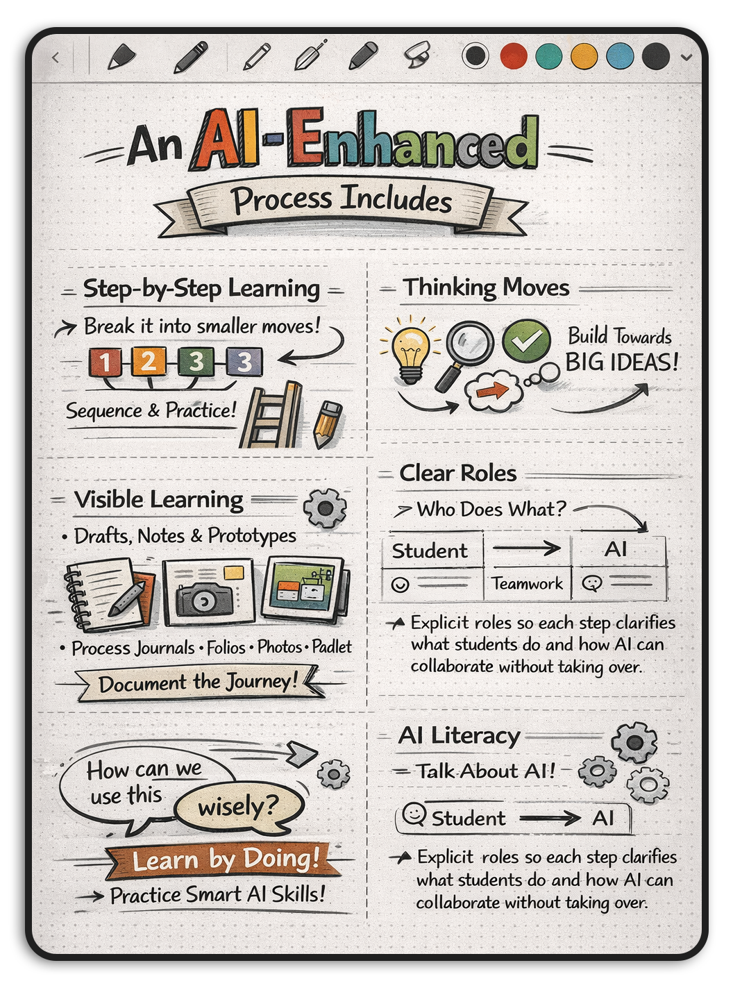 The problem is that AI can generate polished work instantly. So a polished product alone is weaker evidence of thinking than it used to be. That’s why making the thought process visible is powerful. Meaningful learning requires both process AND product. Products give purpose. Processes shape the thinking that makes the product worth creating. Drafts, prototypes, revisions, annotations, and reflections are mini-products that capture thinking along the way.