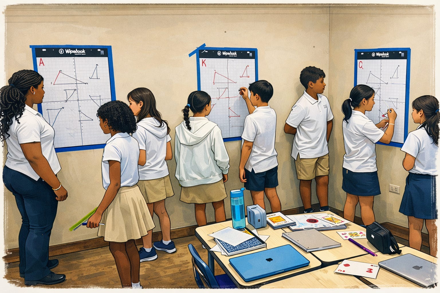 Vertical learning, the Peter Liljedahl move you’re seeing pictured below, is a simple design choice with a huge payoff: get students standing, working in groups, and thinking out loud on visible, shared spaces.
