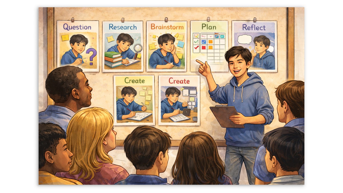 Pro tip: take it one step further and add a third row for breadcrumbs. Under each thinking move, write what students will capture to document their learning and make the thinking visible, for example: a brainstorm snapshot, a decision point, a revision note, a reflection, or a screenshot of a chat. Whatever it might be, it helps you and your students to align around what thinking will look like.
