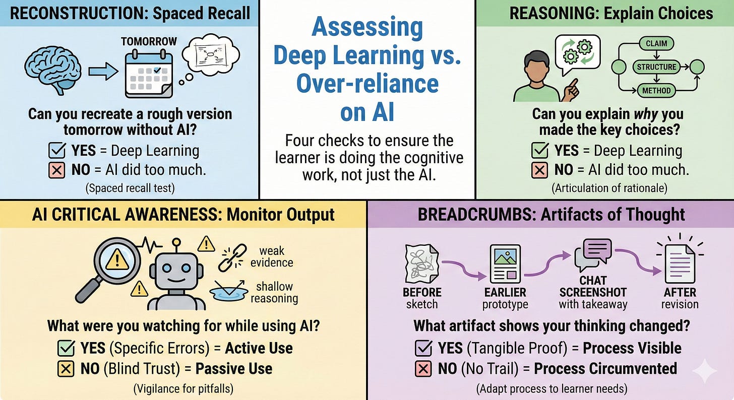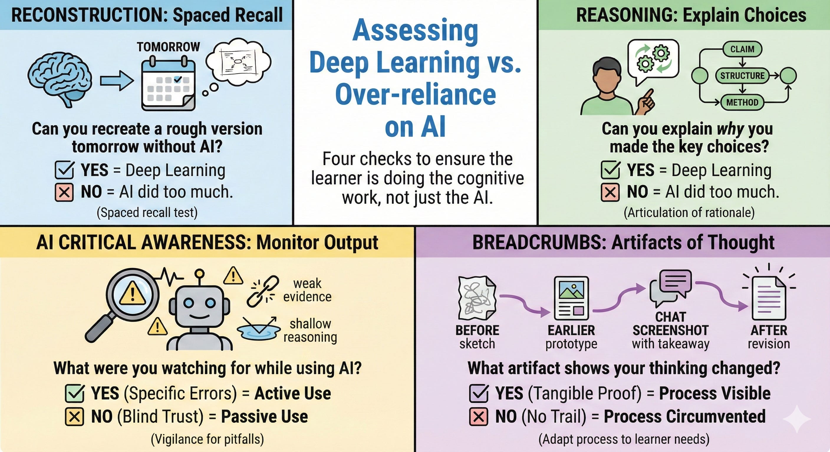 Reconstruction: Could you recreate a rough version tomorrow (spaced recall) without the use of AI? If you can’t, AI might have done too much.