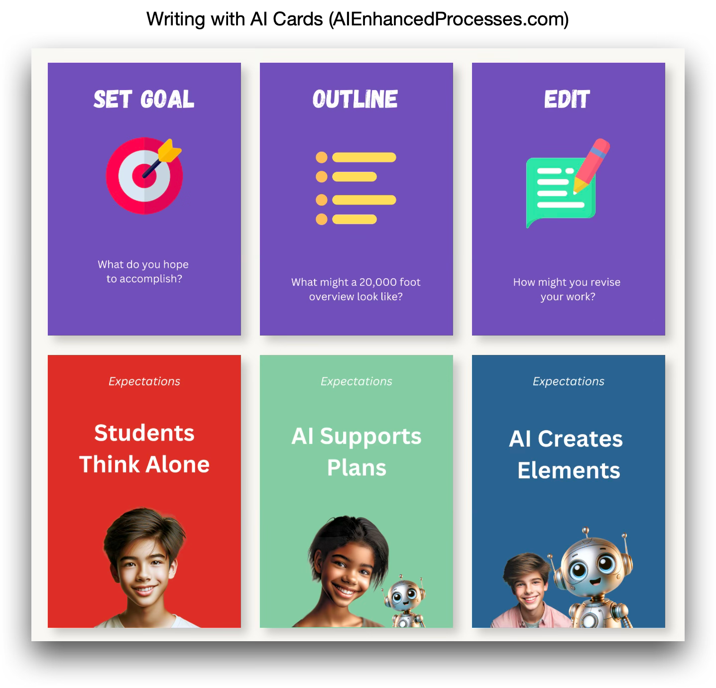 Access material I’ve made for you on AIEnhancedProcesses.com > Downloads has a series of posts with things you can use in your classroom to create a process as a teacher or collaboratively with your students. Below is one tool you can use that focuses on writing processes. The image below shows purple cards that are process word. Underneath them are expectation cards that show to what extent AI can be used in that step of the process.