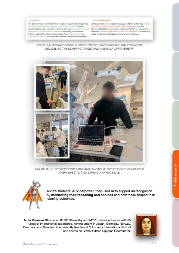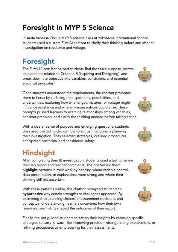 In Anita Vanessa Chou’s MYP 5 science class at Yokohama International School, AI bookends a scientific investigation with Foresight and Hindsight as two forms of metacognition. Before the lab, a Flint chatbot helped students clarify the purpose of the learning task, restate expectations connected to Criterion B, break the objective into variables and constraints, surface questions and uncertainties, and plan a safe investigation with intentional procedures.